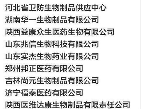 12种疫苗无第一类疫苗,全部为第二类疫苗,分别为冻干人用狂犬病疫苗(Vero细胞)、脊髓灰质炎灭活疫苗、b型流感嗜血杆菌结合疫苗、乙型脑炎减毒活疫苗、腮腺炎减毒活疫苗、冻干乙型脑炎灭活疫苗(Vero细胞)、重组乙型肝炎疫苗(CHO细胞、汉逊酵母)、A群C群脑膜炎球菌结合疫苗、ACYW135群脑膜炎球菌多糖疫苗、水痘减毒活疫苗、口服轮状病毒活疫苗、甲型肝炎灭活疫苗(人二倍体细胞);2种免疫球蛋白分别为狂犬病人免疫球蛋白、乙型肝炎人免疫球蛋白;1种治疗性生物制品,为细菌溶解物。